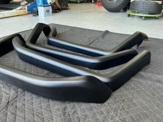 ●仕様:黒ゲルコートFRP製 4ピース 定価:63,000円(税抜き) サイズは、ノーマルより約30mmワイド、前後の 下の部分は、10mmになるように絞り込み。デザインは、FJの特徴のまっすぐなライン崩さないように30mmワイドだけしたのでぱっと見はノーマルぽいです。